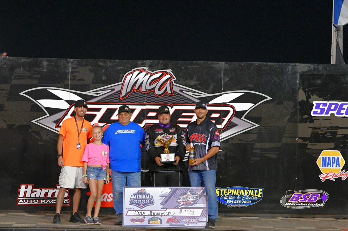 Gifted the pole start when his Fast Shafts All-Star Invitational competition drew every spoon except the one with the one written on it, Thompson led every lap but the first one in winning the special Modified race Friday night during the IMCA Speedway Motors Super Nationals fueled by Casey’s at Boone Speedway.